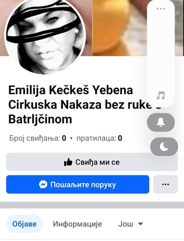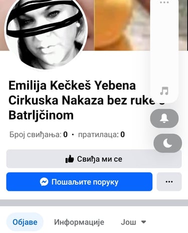 Rodjena sam bez desne podlaktice.Rodbina me odbacila niko cak i ne pita za mene ponasaju se kao da nepostojim.Otac me od malena zlostavlja psihicki i fizicki.Zivela sam u u kuci svog oca ogradjena medju psima posto sam se vise od 20 godina bavila uzgojem rasnih pasa i od toga sam zivela drugi posao nemam.Inace ta kucica u kojoj sam zivela je predvidjena za letnju kuhinju tamo su se zidvi gulili fasada je otpadala otac mi tamo nije dozvolio da mi dodju ljudi da mi okrece iako sam vise puta kupvala i farbu iako je on bio moler tj to je monm ocu bio hobi ali ne da sam nije zelo da mi ikreci nego nije dao ni ljudima da dodju da mi okrece.Rodjeni brat me ne kontaktira vise od 10 godina decu mu ne poznajem kad dodje da poseti oca izvede ga u restoran a mene cak i ne pita kako sam ponasa se kao da ne postojim.Pored svega ovoga pet dugih godina troim tesko inrernetsko zlostavkjanje od strane jedne zene iz Hrvatake Loredane Laca koja se na internetu predstavkjja kao propovednik i koja me vec pet godina zlostavlja izruguje me se zbog hensikepa na najbrutalniji moguci nacin bez imalo milosti otvarajuci mi na destina laznih youtube kanala i facebook profila na mije ime sa mojim skikom tu objavljuje lazi i klevete o meni izruguje mi se zbog hendikepa na najbrutalniji nacin.Zovem se Emiluja Keckes i rodjena sam bez desne podlaktice.Rodbina me odbacila niko cak i ne pita za mene ponasaju se kao da nepostojim.Otac me od malena zlostavlja psihicki i fizicki.Zivela sam u u kuci svog oca ogradjena medju psima posto sam se vise od 20 godina bavila uzgojem rasnih pasa i od toga sam zivela drugi posao nemam.Inace ta kucica u kojoj sam zivela je predvidjena za letnju kuhinju tamo su se zidvi gulili fasada je otpadala otac mi tamo nije dozvolio da mi dodju ljudi da mi okrece iako sam vise puta kupvala i farbu iako je on bio moler tj to je monm ocu bio hobi ali ne da sam nije zelo da mi ikreci nego nije dao ni ljudima da dodju da mi okrece.Rodjeni brat me ne kontaktira vise od 10 godina decu mu ne poznajem kad dodje da poseti oca izvede ga u restoran a mene cak i ne pita kako sam ponasa se kao da ne postojim.Pored svega ovoga pet dugih godina trpim tesko internetsko zlostavljanje od strane jedne zene iz Hrvatake Loredane Laca tzv.ISUSOV RATNIK koja se na internetu predstavkjja kao propovednik i koja me vec pet godina zlostavlja izruguje me se zbog hensikepa na najbrutalniji moguci nacin bez imalo milosti otvarajuci mi na destina laznih youtube kanala i facebook profila na mije ime sa mojim skikom tu objavljuje lazi i klevete o meni izruguje mi se zbog hendikepa na najbrutalniji nacin.